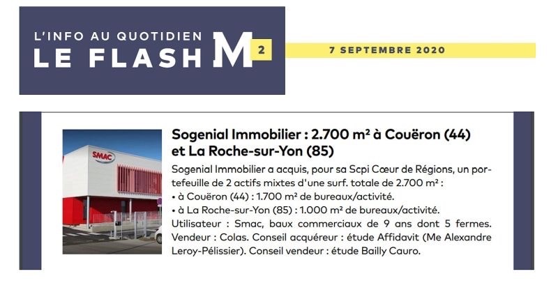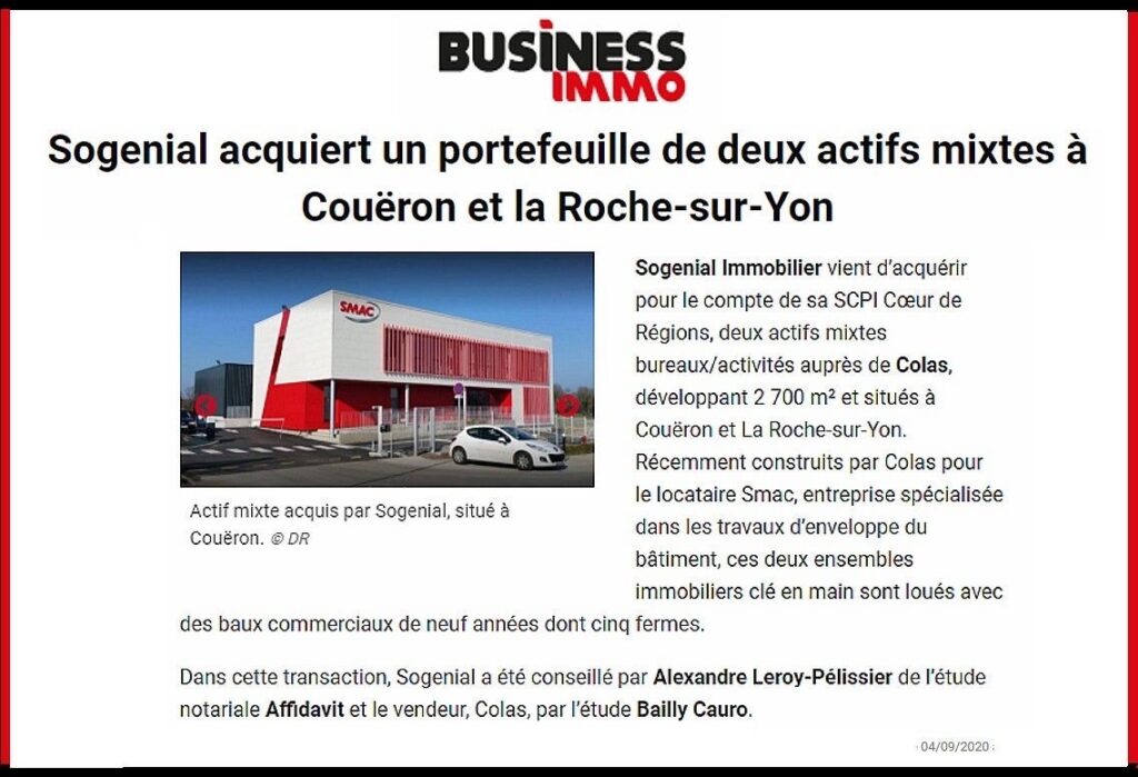 Dans cette transaction, Sogenial a été conseillé par Alexandre Leroy-Pélissier de l’étude notariale Affidavit et le vendeur, Colas, par l’étude Bailly Cauro.