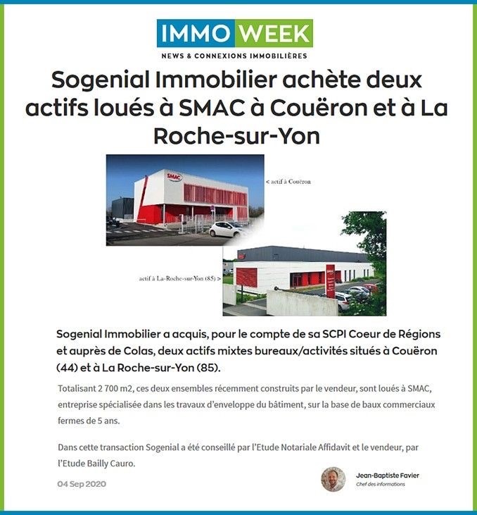 Sogenial Immobilier vient d’acquérir pour le compte de sa SCPI Cœur de Régions, deux actifs mixtes bureaux/activités auprès de Colas, développant 2 700 m² et situés à Couëron et La Roche-sur-Yon. Récemment construits par Colas pour le locataire Smac, entreprise spécialisée dans les travaux d’enveloppe du bâtiment, ces deux ensembles immobiliers clé en main sont loué avec des baux commerciaux de neuf années dont cinq fermes.